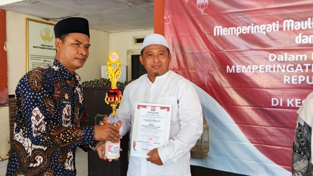 Ku – Ketua Panitia HUT (Hari Ulang Tahun) Ke-80 Kemerdekaan Republik Indonesia menyerahkan hadiah bagi para pemenang Lomba Membuat Kata-Kata Bijak dalam rangka memperingati HUT Ke-80 Kemerdekaan Republik Indonesia Kecamatan Pragaan.
